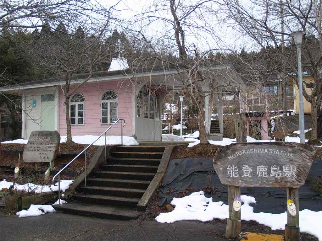 ホームにさくら(ソメイヨシノ)があり名所となっているためか、ピンク色のメルヘン駅舎。