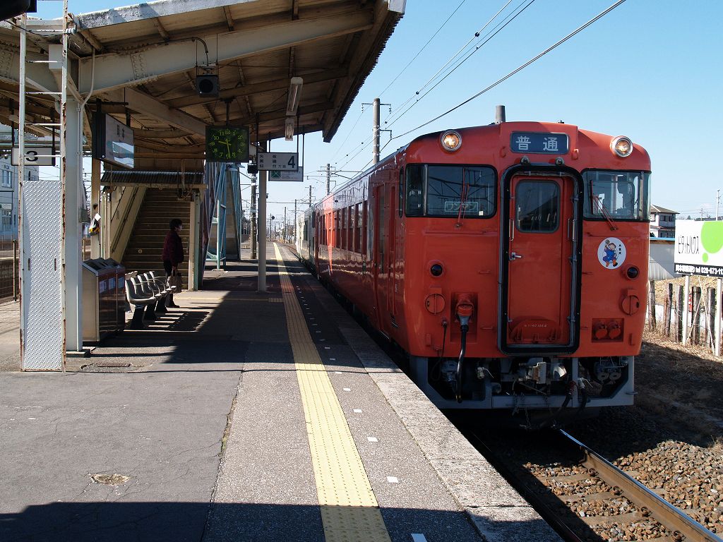 朱色1色のキハ40です。岡本駅4番線に入線。烏山行きです。